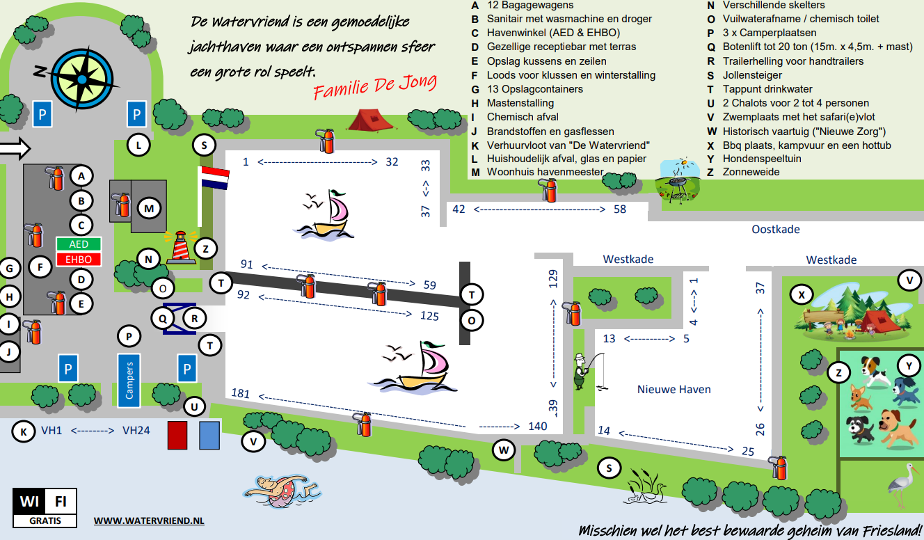 Wij, Arie en Tamara de Jong, heten u van harte welkom bij Jachthaven De Watervriend, waar een gemoedelijke sfeer een belangrijke rol speelt. Sinds 2008 wonen en werken wij met onze drie dochters op dit prachtig stukje Friesland, centraal gelegen in het merengebied nabij het Sneekermeer en in het natuurgebied tussen Sneek en Joure. Onze jachthaven biedt een ideaal startpunt voor het maken van diverse vaartochten waarbij het zeker de moeite waard is de talrijke aanlegplaatsen van Stichting Marrekrite in dit vaargebied aan te doen.